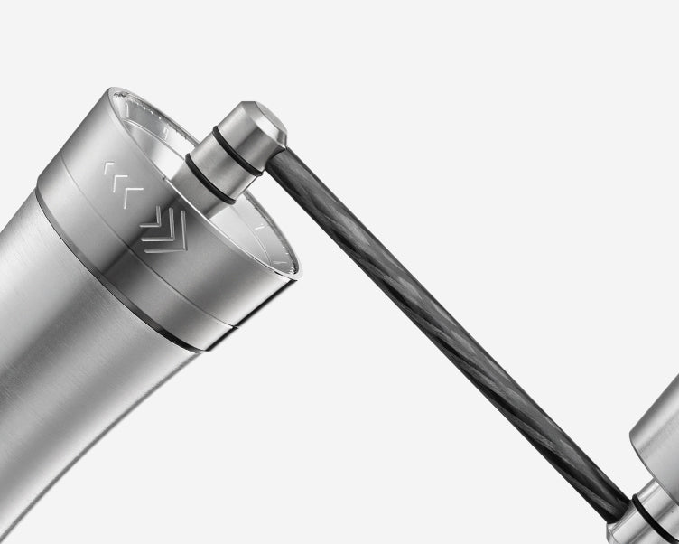 Omega features carbon fibre components for strength and lightness, neodymium magnets for clever use and storage, stainless steel and aluminum to optimize mechanical performance and tactile feeling. The ergonomic opening with a swift-release knob enables effortless loading of coffee beans.